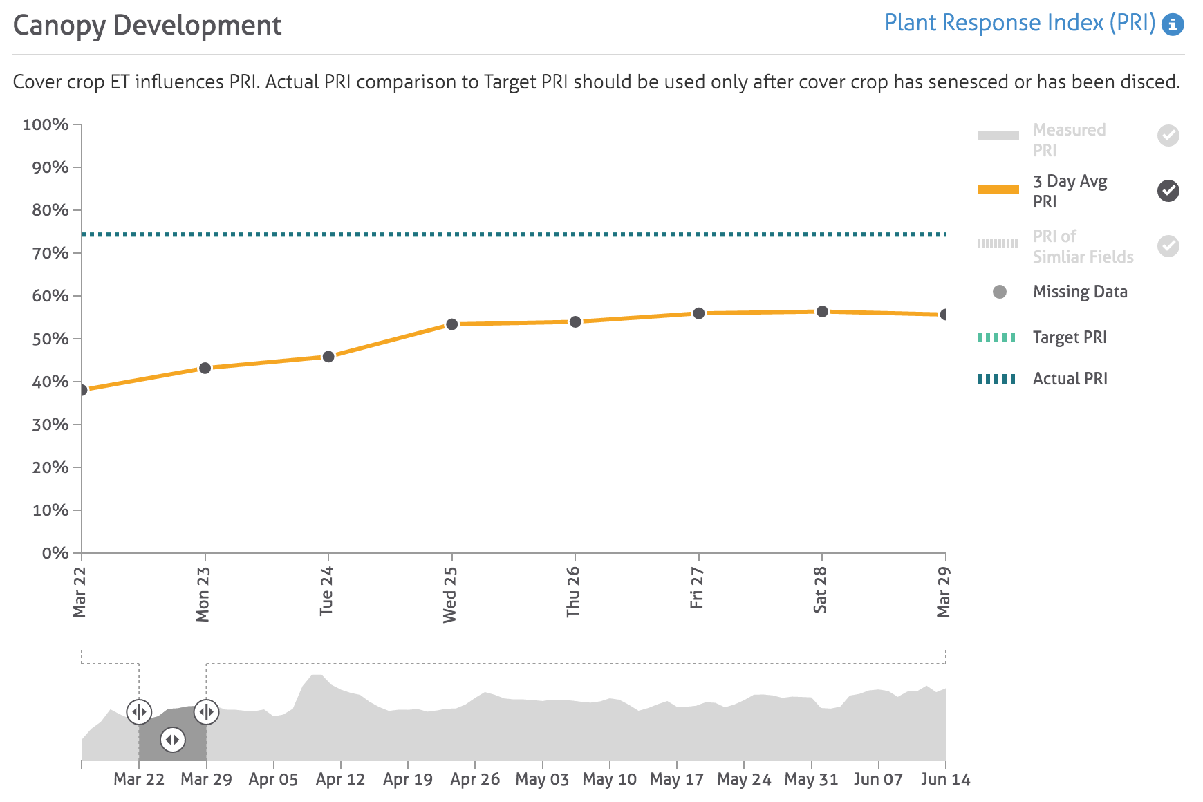 To use this tool, we assume you are familiar with the Plant Response Index (PRI). For our purposes in this article, it is important to remember the PRI increases as the canopy develops in your field.